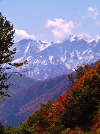 写真は初冠雪をした白山とスーパー林道の紅葉のコラボです。